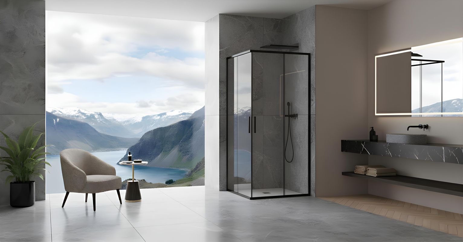 Design: Con telaio extra slimChiusura: ScorrevoleCOLORE PROFILO: Chrome, Brushed Nicked, Brushed Gold, Blackvetro: Chiaro con trattamento anticalcare